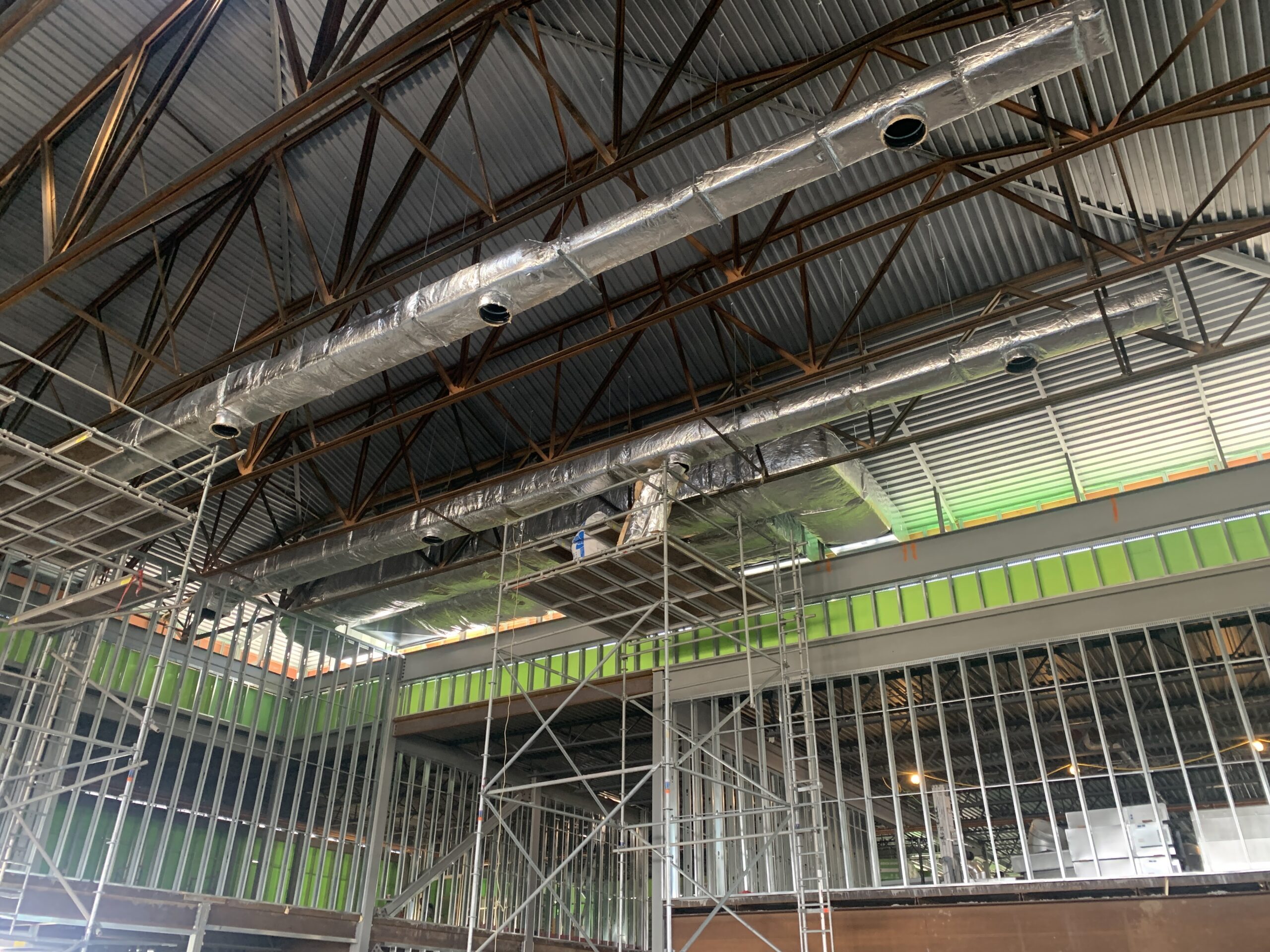 - Interior dry wall and door frame installation is proceeding.