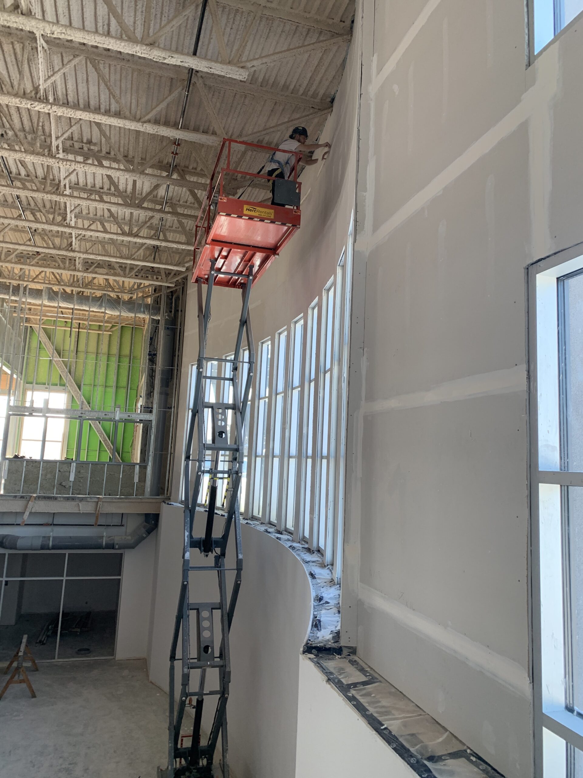 - Interior work continues including steel stud framing, insulation, drywall, mechanical rough-ins, electrical rough-ins, fire-spray, and primer/paint.