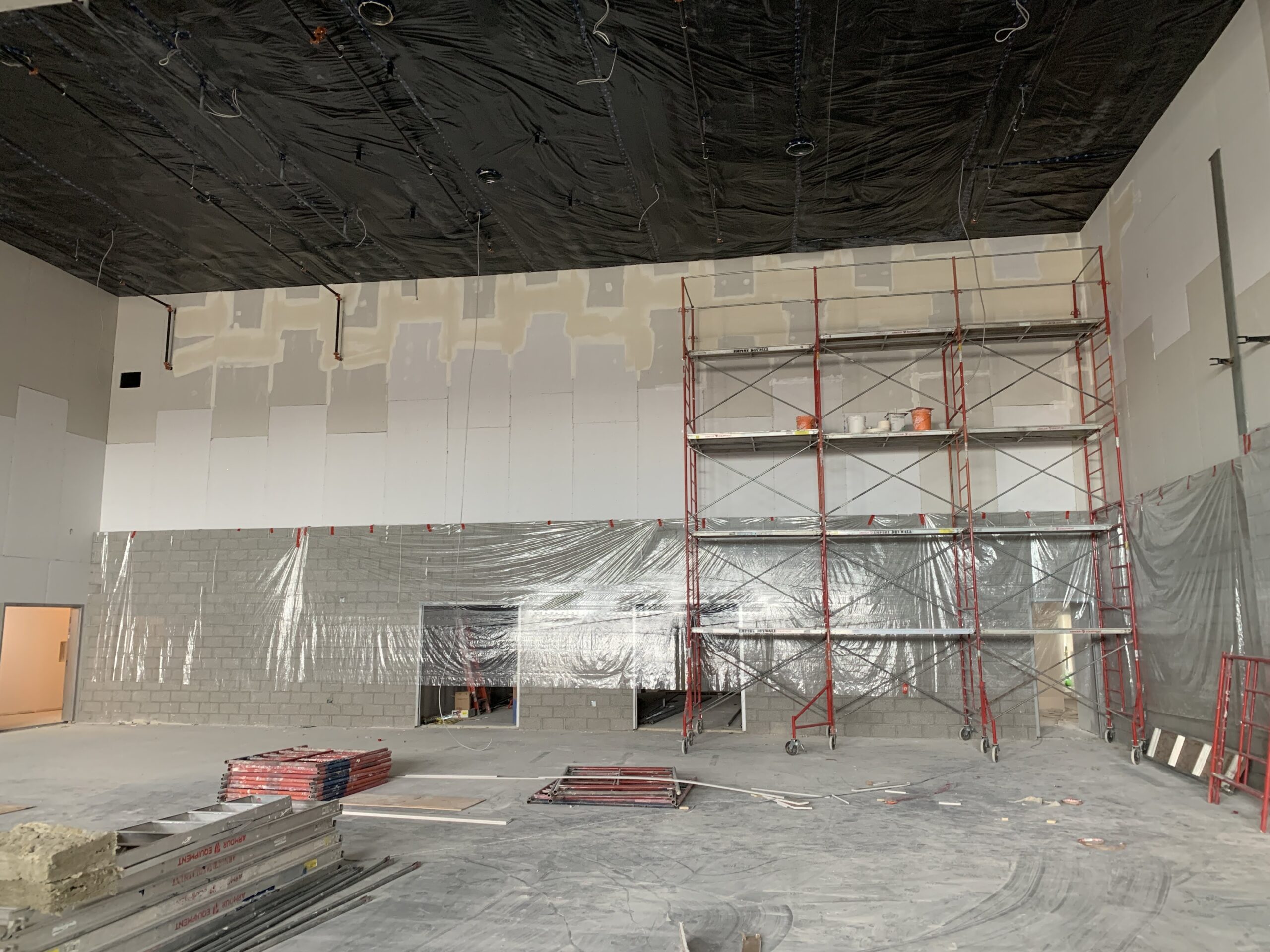 - Interior work continues including steel stud framing, insulation, drywall, mechanical rough-ins, electrical rough-ins, fire-spray, and primer/paint.