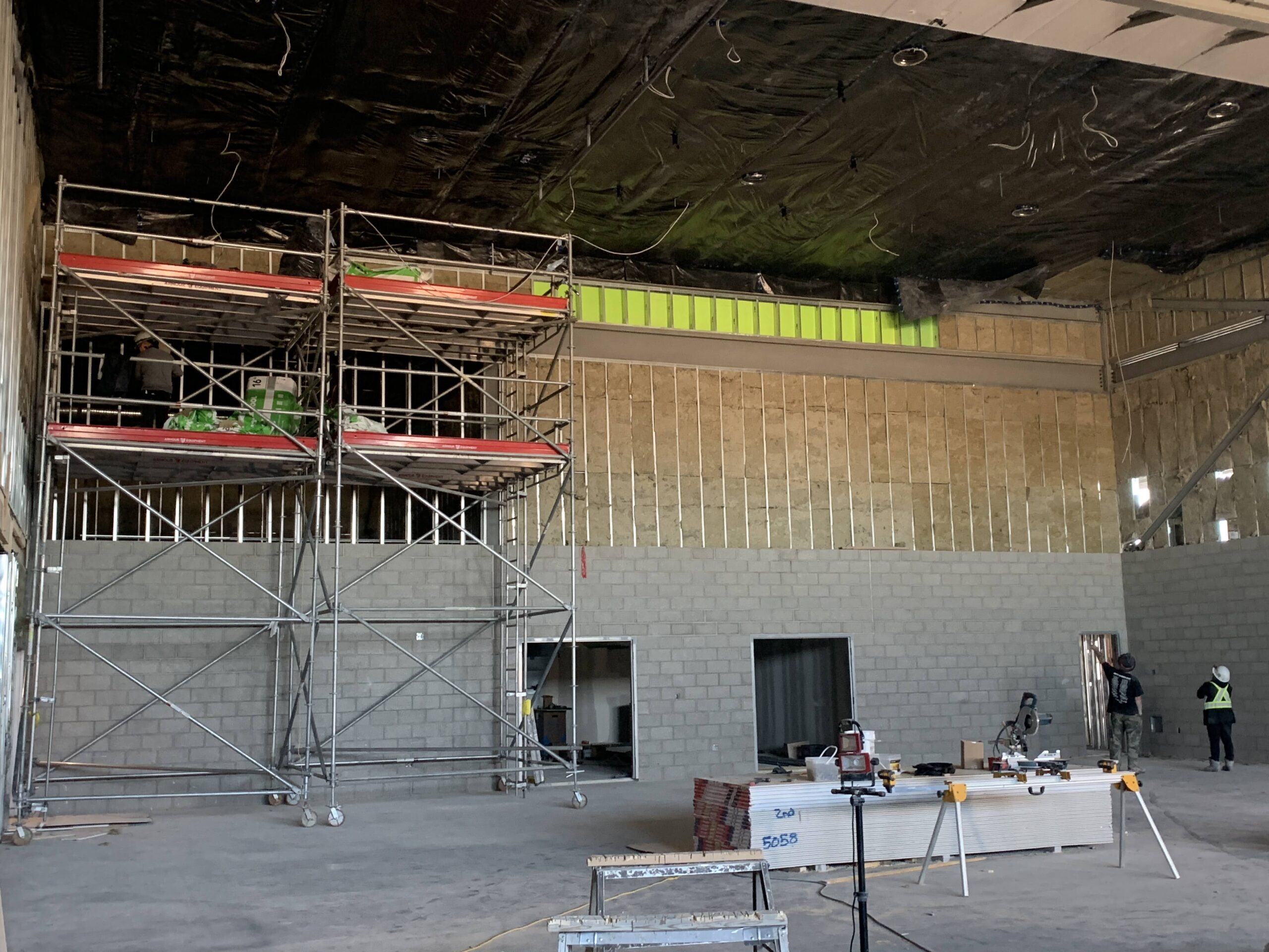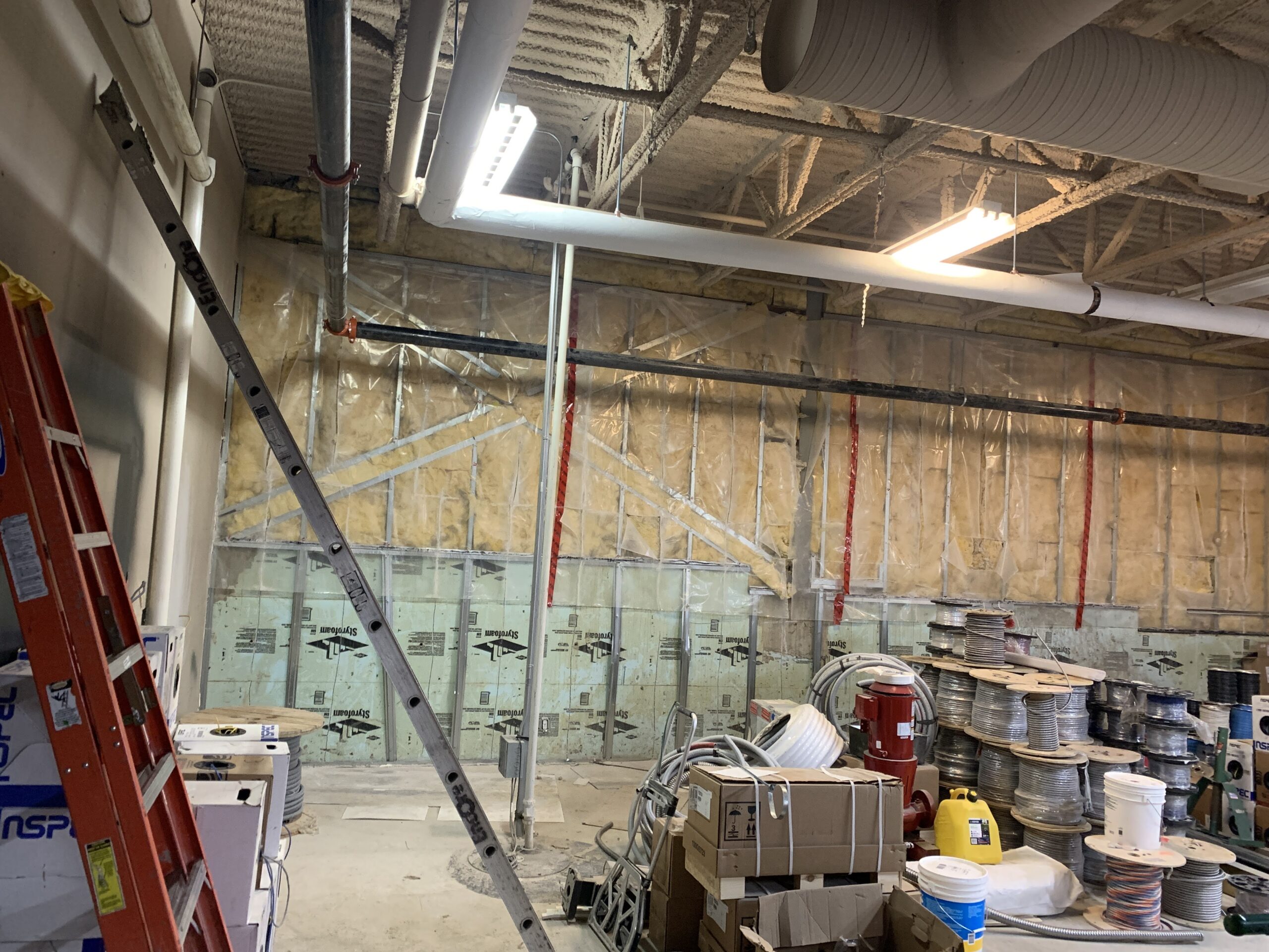 - Interior work continues including steel stud framing, insulation, drywall, mechanical rough-ins, electrical rough-ins, fire-spray, and primer/paint.