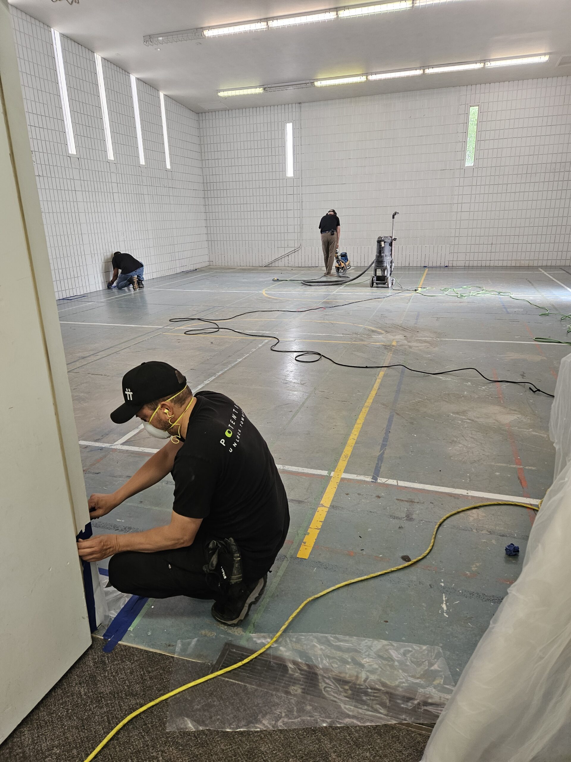 - Grinding down the gym floor and to prep it for the new epoxy finish.