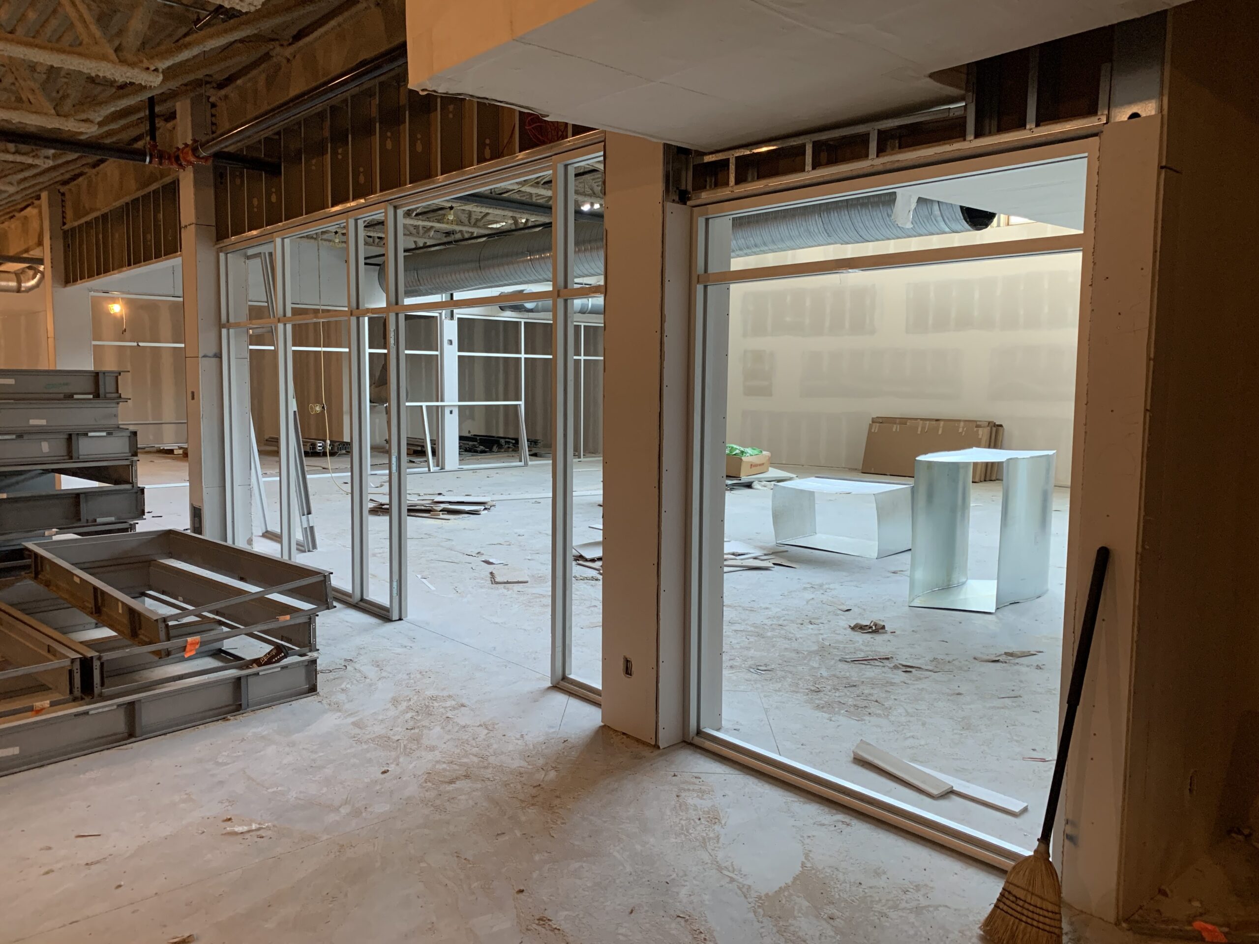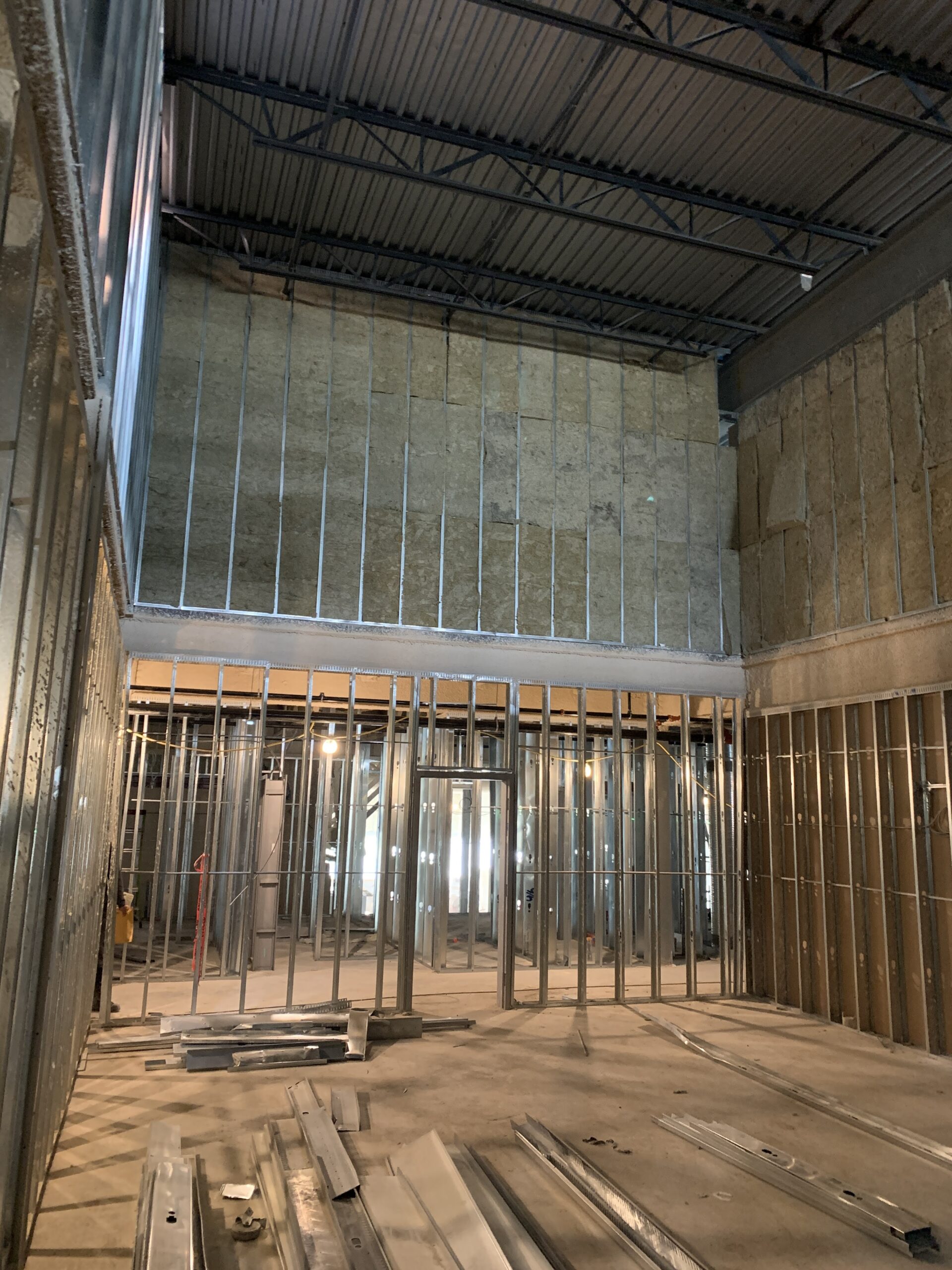 - Interior work continues including steel stud framing, insulation, drywall, mechanical rough-ins, electrical rough-ins, fire-spray is continuing.